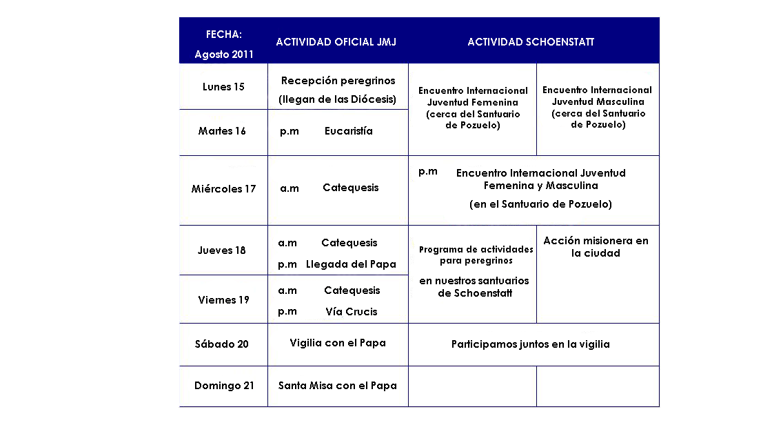 No os imagináis cuánta ilusión nos hace el invitaros a la XXII Jornada Mundial de la Juventud que tendrá lugar en Madrid en agosto de 2011. El Papa viene a Madrid a reunirse con nosotros y miles de jóvenes de todo el mundo, ¿no es impresionante? Esperamos de todo corazón que vengáis, ¡os estamos esperando con los brazos abiertos!